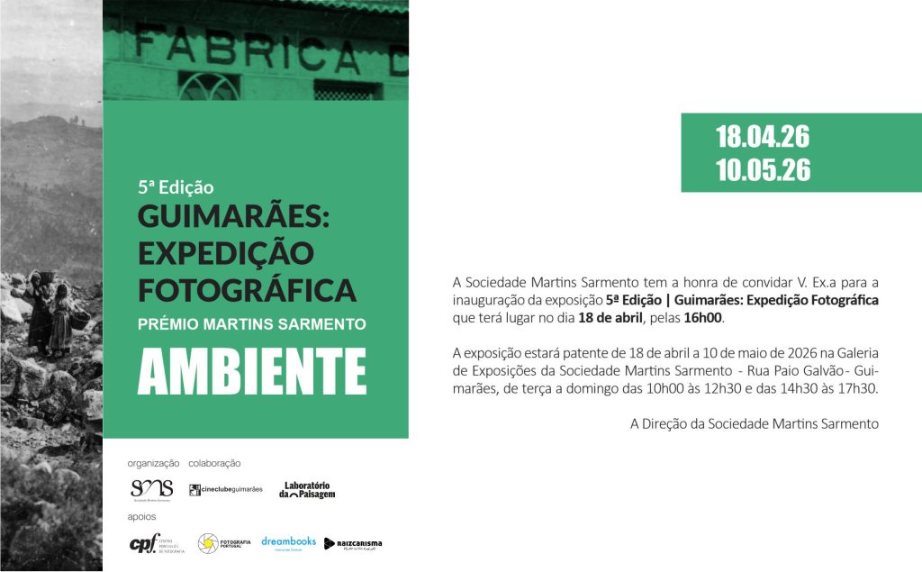 A Sociedade Martins Sarmento tem a honra de convidar V. Exa. para a inauguração da exposição 5ª Edição | Guimarães: Expedição Fotográfica que terá lugar no próximo dia 18 de abril, pelas 16h00. A exposição estará patente de 18 de abril a 10 de maio de 2026 na Galeria de Exposições da Sociedade Martins Sarmento – Rua Paio Galvão – Guimarães, de terça a domingo das 10h00 às 12h30 e das 14h30 às 17h30. A Direção da Sociedade Martins Sarmento