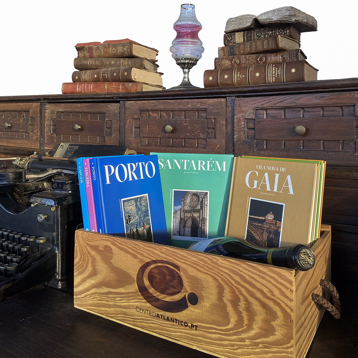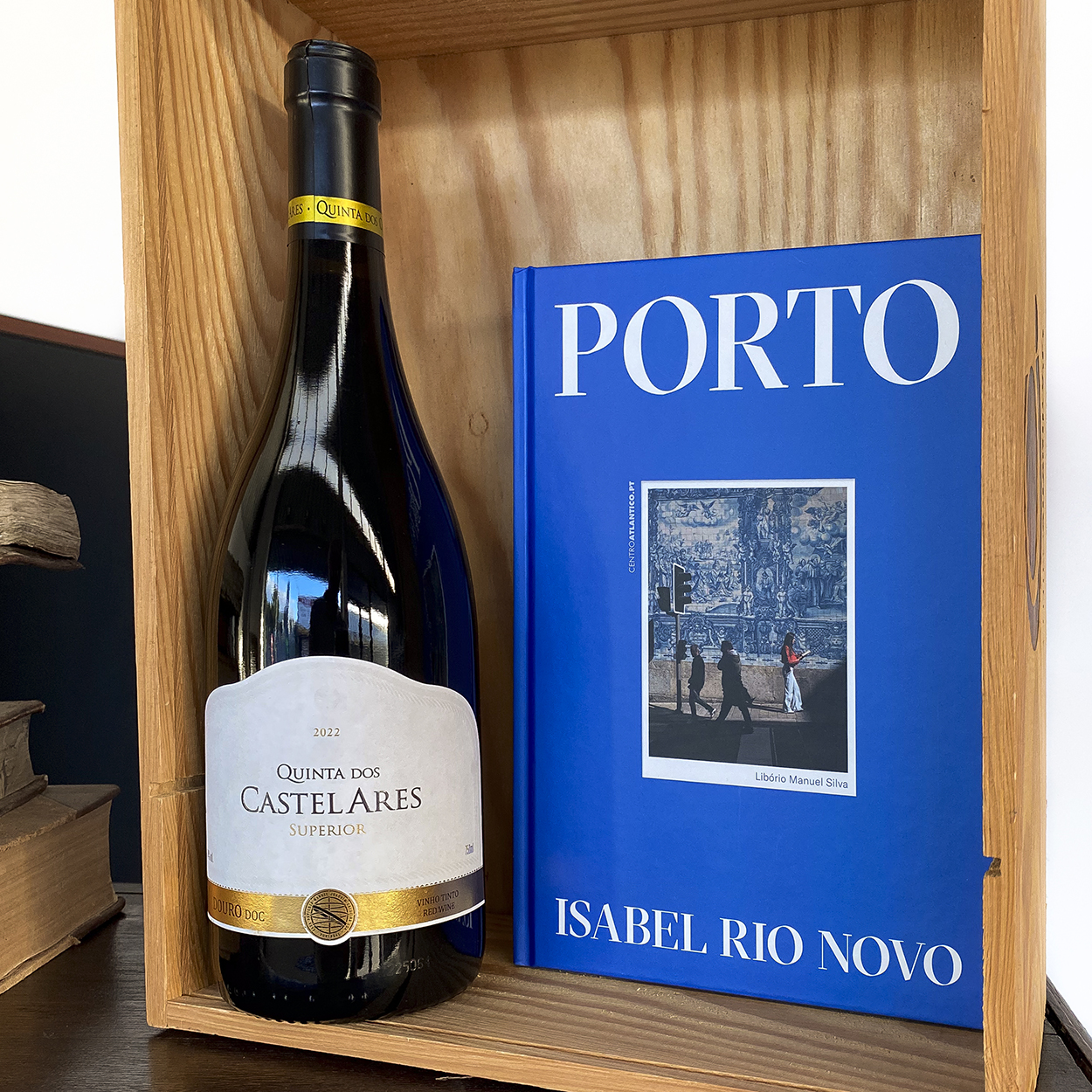Caixa de madeira com livro «Porto» + 4 outros volumes da Coleção Portugal + garrafa de vinho Quinta dos Castelares Superior (Tinto, Vinho Douro DOC, 2022, 14% vol, 0,75l)